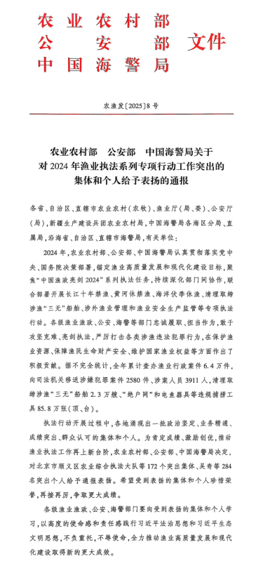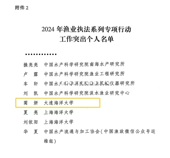 近日,农业农村部、公安部、中国海警局联合印发了《关于对2024年渔业执法系列专项行动工作突出的集体和个人给予表扬的通报》,对2024年渔业执法行动开展过程中政治坚定、业务精通、成绩突出、群众认可的172个突出集体和284名突出个人给予通报表扬。Betano中文 教师蔺妍作为2024年渔业执法系列专项行动工作突出个人获通报表扬。