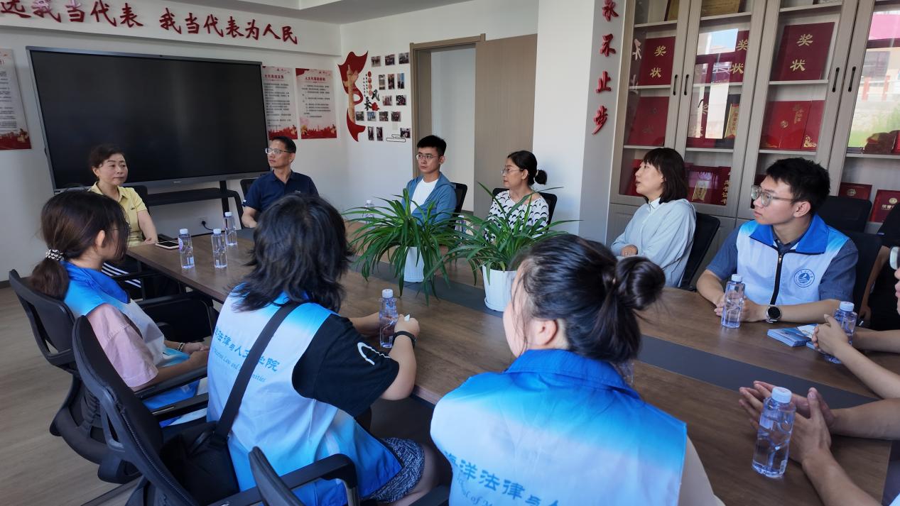 在杨家村委会,张聪书记为学院师生就海上渔民安全生产普法、“青少年法治教育书屋”“法治故事会”等特色活动进行了详细介绍。