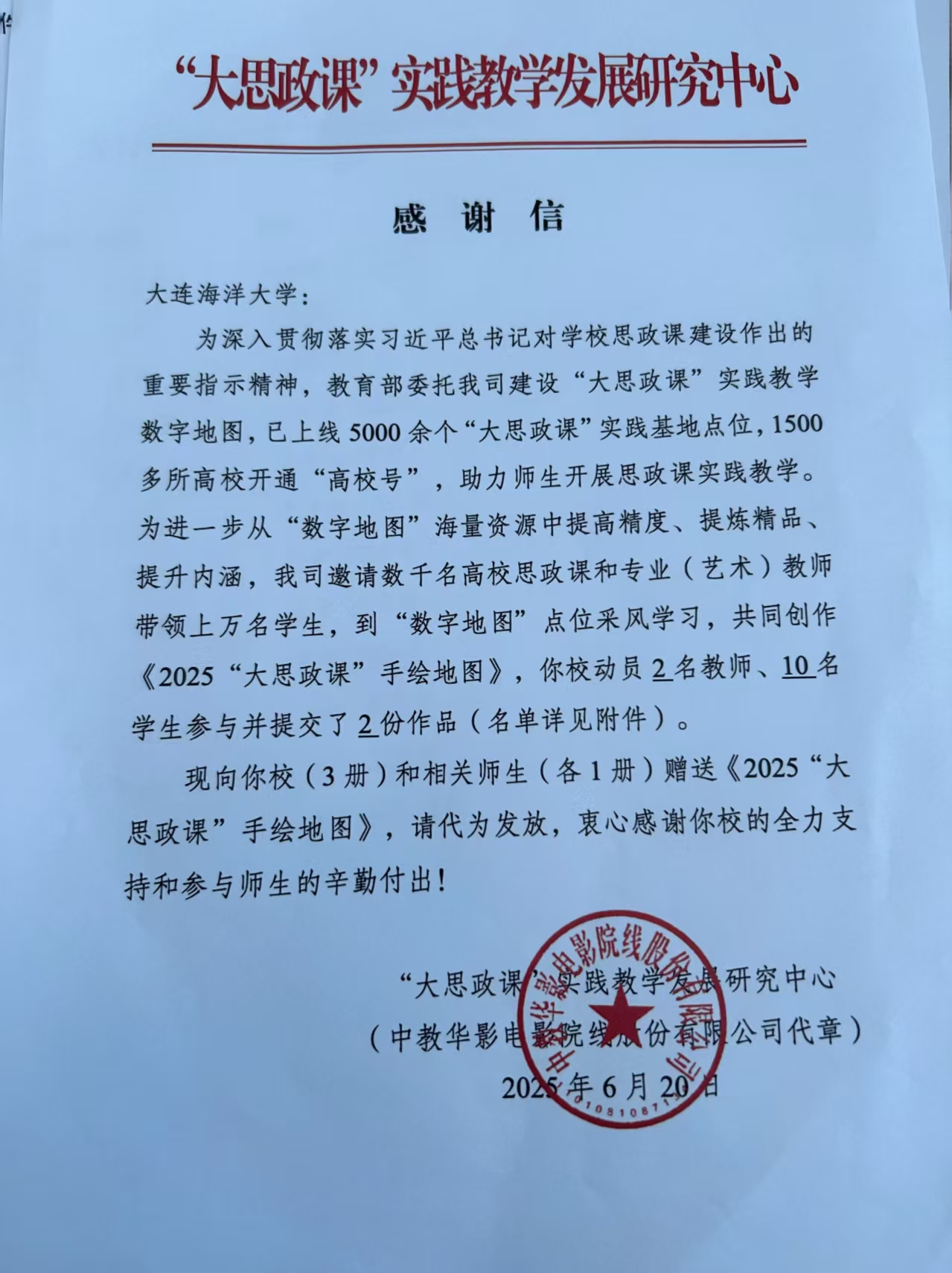 近日,“大思政课”实践教学发展研究中心致函我校,对马克思主义学院及Betano中文 师生在参与教育部委托建设的“大思政课”实践教学数字地图创作和《2025“大思政课”手绘地图》编撰工作中的突出贡献表示肯定。