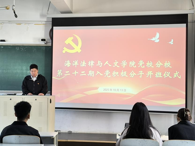 10月13日,我院于大黑石校区2教202教室召开第二十二期入党积极分子培训班开班仪式。我院党校分校副校长、党委副书记、本科生党支部书记滕鹏,学院组织员杨毅,本科生党支部组织委员邱愉珊,2025级辅导员张恒毅、研究生第一党支部书记张曼群、研究生第二党支部书记杨学钱及第二十二期全体入党积极分子参加本次开班仪式,本次会议由邱愉珊主持。