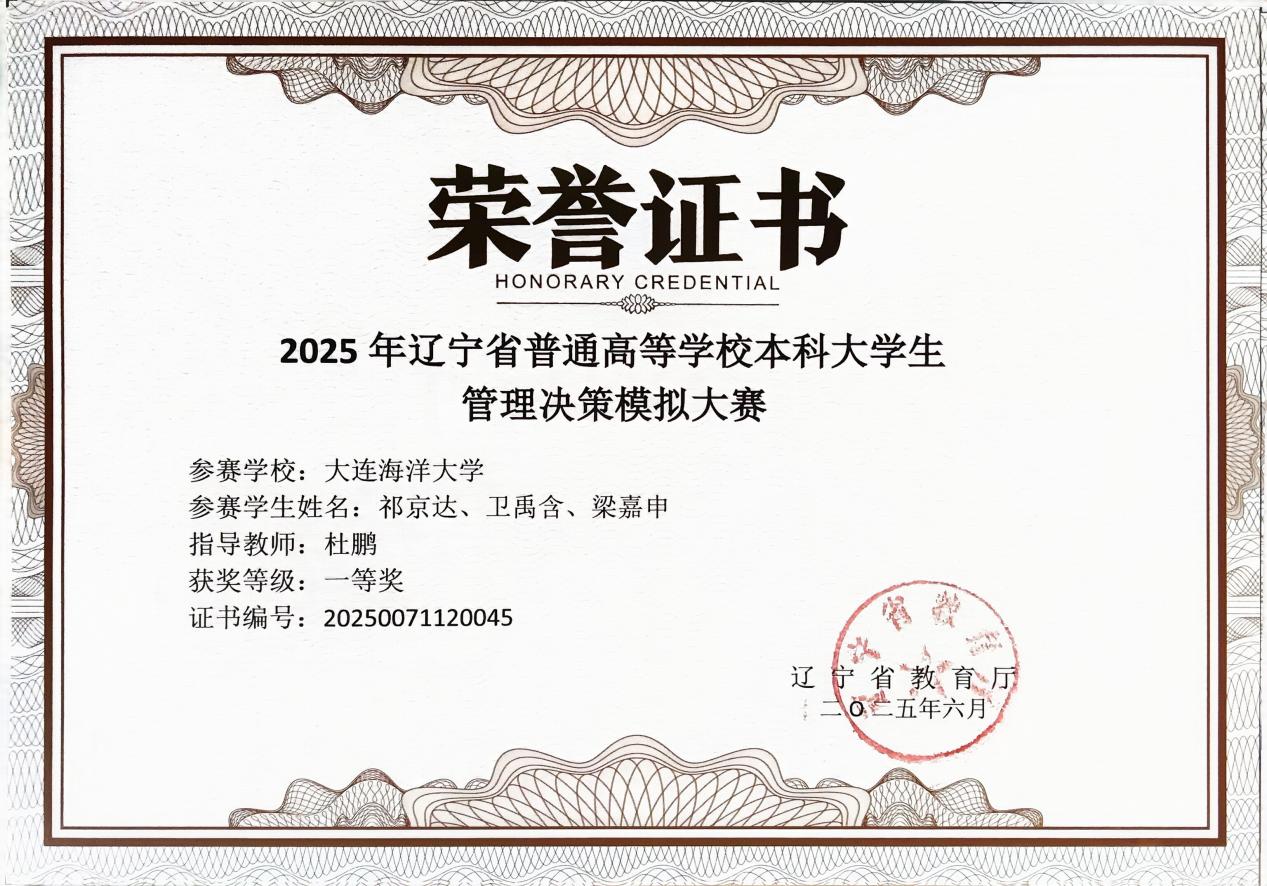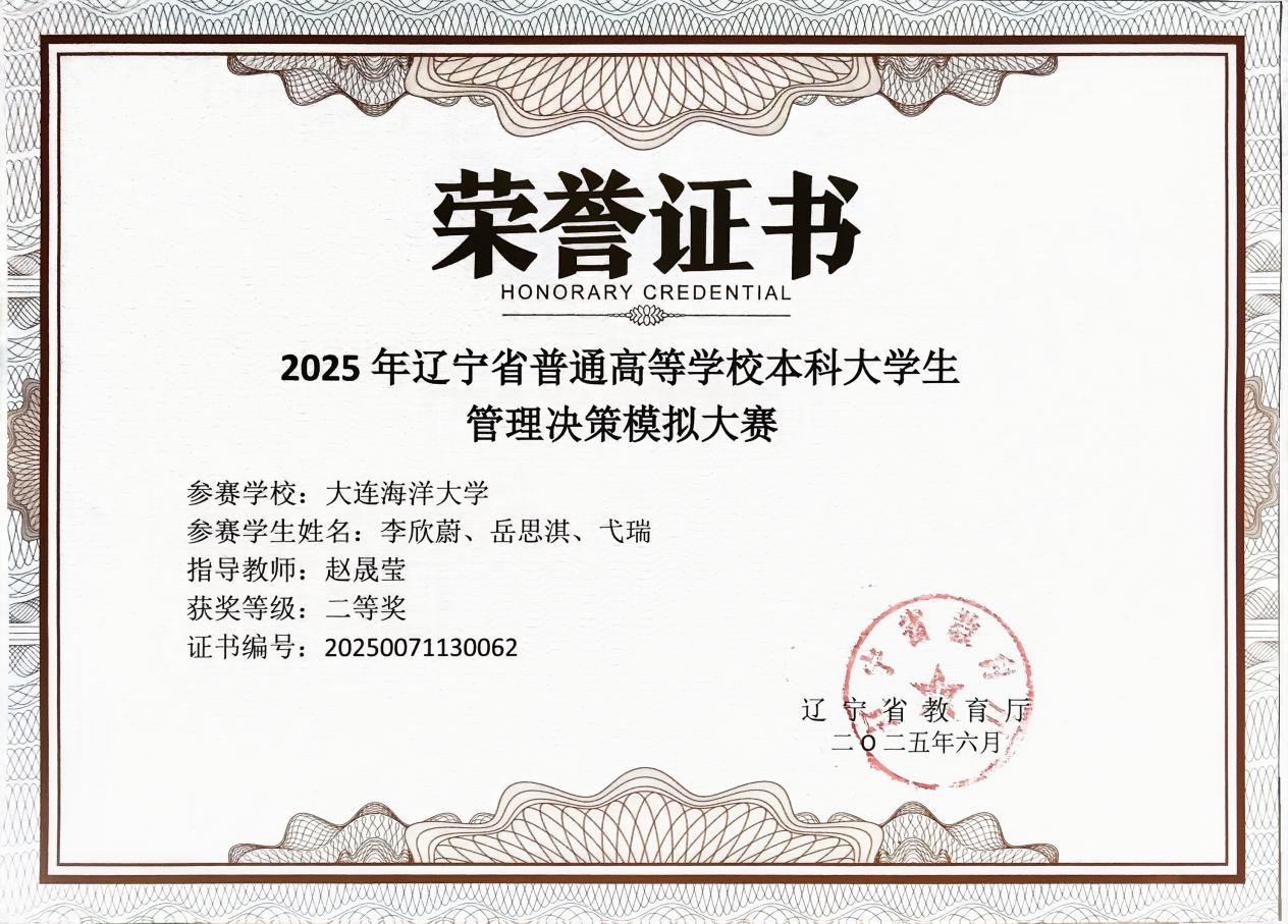 6月7日,由辽宁省教育厅主办、大连大学承办的“2025年辽宁省普通高等学校本科大学生管理决策模拟大赛”圆满闭幕。在杜鹏、赵晟莹两位老师的指导下,Betano中文 人力资源管理专业祁京达团队(成员:卫禹含、梁嘉申)荣获省级一等奖、李欣蔚团队(成员:岳思淇、弋瑞)荣获省级二等奖。