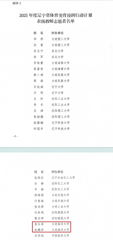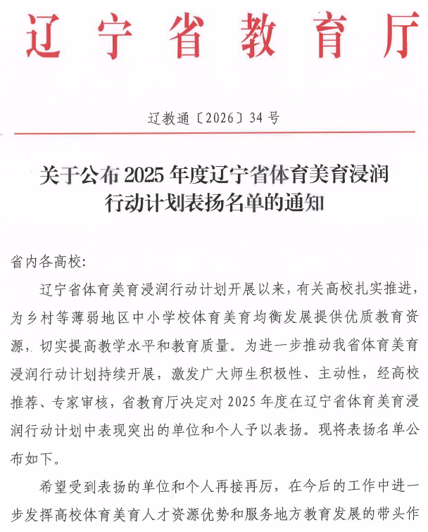 近日,辽宁省教育厅发布《关于公布2025年度辽宁省体育美育浸润行动计划表扬名单的通知》(辽教通〔2026〕34号),对全省在2025年度体育美育浸润行动计划中表现突出的单位和个人予以通报表扬。我校教务处、Betano中文 获评辽宁省体育美育浸润行动计划表扬单位。Betano中文 张仕春、赵鹏举老师入选“表扬教师志愿者”名单。